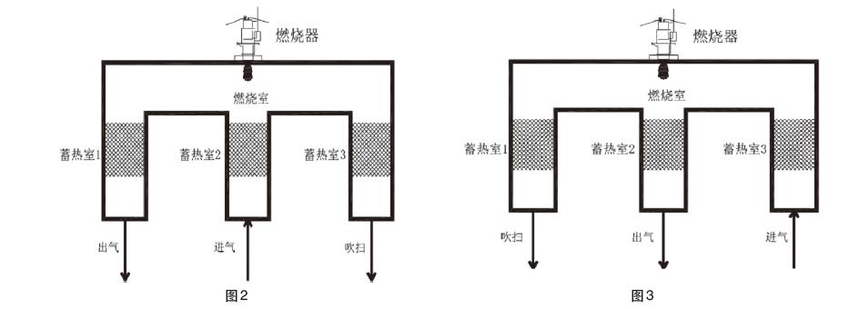 待蓄熱室3里面蓄熱體熱量吸附飽和后,切換閥進行切換,如圖2所示。廢氣進入蓄熱室3,經(jīng)過高溫預熱后,進入燃燒室,從蓄熱室2出,熱量為蓄熱室2所吸收,直至蓄熱室2吸附飽和,開始切換。如圖3所示進入下一個流程,3次切換為一個,如此運行。RTO切換閥切換時間,一般為60s-120s,切