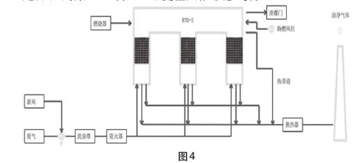 在廢氣處理項目中,3塔RTO一般與風機,噴淋塔,阻火器,煙囪等組成一個系統(tǒng)。RTO一般正壓運行,風機應選擇變頻控制適應不同工況。前置噴淋塔可吸收酸、堿性廢氣,減少對RTO爐的腐蝕。后置噴淋塔可進一步降低廢氣排放量。有的有熱回收需求,可在末端增設熱交換器,產(chǎn)生熱水和熱氣回用。煙囪可根據(jù)項目需要設計,一般至少為15米高,煙囪越高對廢氣擴散有利,成本也越高。系統(tǒng)的組成需要根據(jù)項目來設定,圖4為某RTO項目工藝流程圖(供參考)。