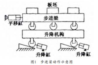 500機組加熱爐目前采用的是推鋼式出鋼,此種方式容易產(chǎn)生黑印、 粘鋼等弊端, 嚴重影響鋼材軋制的質(zhì)量, 應(yīng)改為目前為常用的步進梁出鋼方式。 步進梁式系統(tǒng)具有技術(shù)成熟、 出鋼高效等點, 其動作方式如圖1所示: