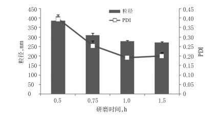 2.1.3研磨時間的篩選稱取BRE原料藥7.5g,置于含有吐溫80(1.125g)的水溶液(22.5mL)中,攪拌混懸,加入氧化鋯珠(粒徑為0.6mm)450g,分別研磨0.5、0.75、1.0、1.5h,制備3批BRE納米晶混懸液。以BRE納米晶混懸液的粒徑、PDI為指標,篩選研磨時間。結(jié)果,隨著研磨時間的延長,BRE納米晶混懸液的粒徑、PDI逐漸減??;研磨0.5、0.75、1.0h時,BRE納米晶混懸液的粒徑、PDI減小的幅度較大;研磨1.5h時,BRE納米晶混懸液粒徑雖然較研磨1.0h時的粒徑減小,但減小幅度不大。綜合考慮能耗和時間,確定研磨時間為1h。研磨時間的篩選結(jié)果見圖3。