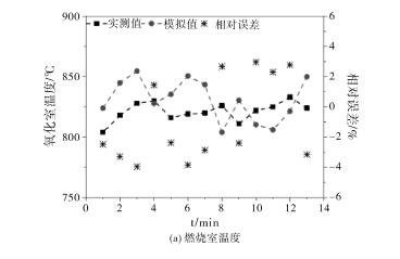 在連續(xù)監(jiān)測穩(wěn)定運(yùn)行階段多個(gè)切換周期后,將燃燒室三個(gè)熱電偶及變送器監(jiān)測的爐膛溫度值計(jì)算得到平均值,同時(shí)將每個(gè)蓄熱室中的出口位置熱電偶的溫度值進(jìn)行記錄,圖2為同一測點(diǎn)的工程實(shí)際數(shù)據(jù)與數(shù)值模擬值的對比。通過對比,得到溫度模擬數(shù)據(jù)與實(shí)際監(jiān)測值的相對誤差均在4%以內(nèi),這也可能是RTO裝置的切換閥因閥板和閥座密封性很難保證、氧化爐爐膛上部的防爆裝置存在泄漏,以及溫度監(jiān)測設(shè)備的精確度不夠等問題造成的。因此,燃燒室和蓄熱室溫度測點(diǎn)監(jiān)測值的平均值和模擬值相對誤差滿足數(shù)值模型準(zhǔn)確性的要求,所以此數(shù)值模型可以較好的反應(yīng)RTO裝置在正常運(yùn)行階段的溫度變化情況。
